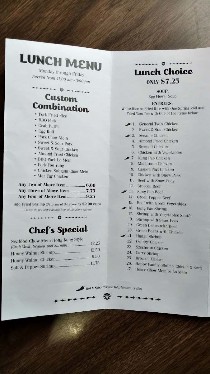 BBQ pork,Pot Stickers,pork chow mein, mar far chicken, crab puffs, sweet and sour pork, egg roll, chicken subgum chow mein, sweet and sour chicken, BBQ pork lo mein, almond fried chicken, pork fried rice, pork foo young.