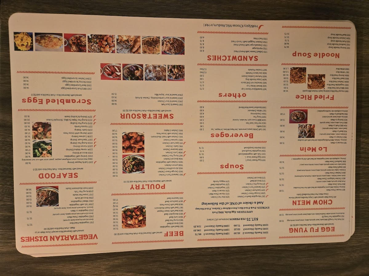 BBQ pork, pork chow mein, mar far chicken, crab puffs, meatless chow mein, sweet and sour pork, egg roll, chicken subgum chow mein, sweet and sour chicken, mix vegetable, BBQ pork lo mein, almond fried chicken, pork fried rice, pork foo young.