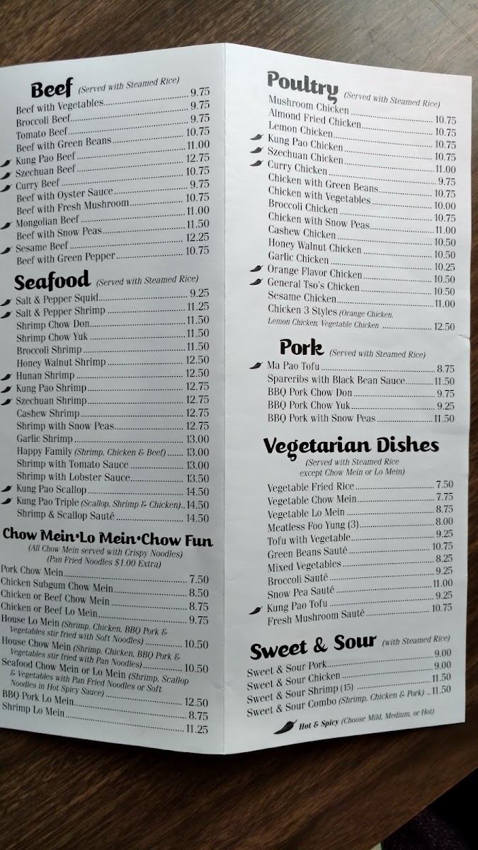 BBQ pork,Pot Stickers, pork chow mein, mar far chicken, crab puffs, sweet and sour pork, Spring roll,egg roll, chicken subgum chow mein, sweet and sour chicken, BBQ pork lo mein, almond fried chicken, pork fried rice, pork foo young.