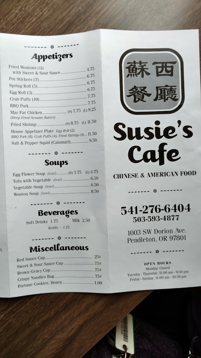 Welcome to Susie's Cafe, located at 1003 SW Dorion Ave in Pendleton, OR. This delightful restaurant has quickly become a beloved spot for authentic Chinese cuisine, praised for its generous portions and welcoming atmosphere. Customers rave about the quality of ingredients, assuring you that the chicken and pork truly reflect the authenticity of the dishes.